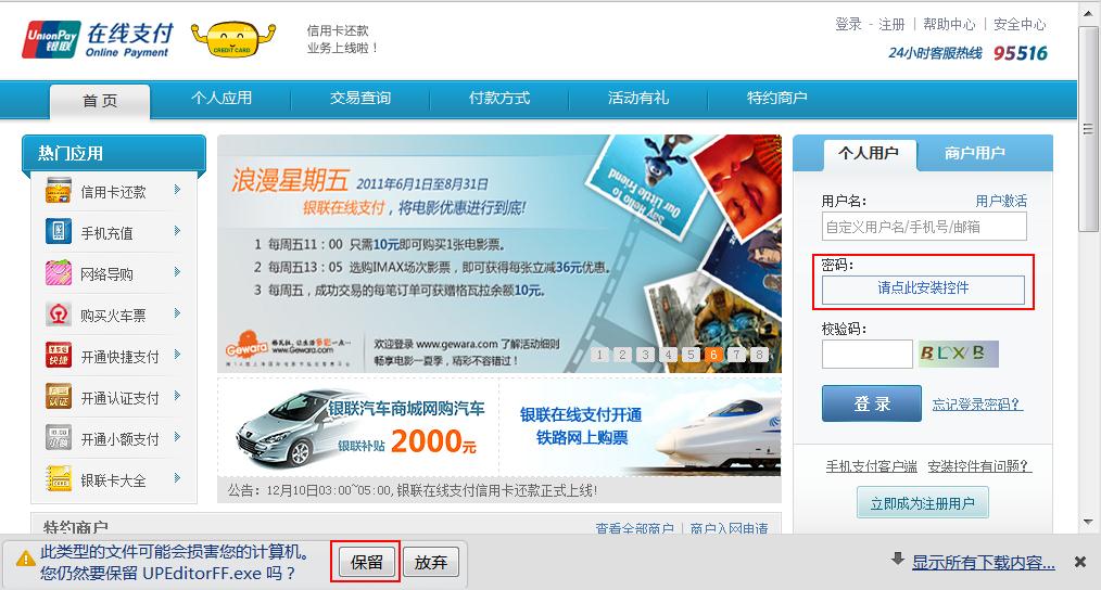 安全控件安装不成功,可能和您浏览器的设置有关,建议您按照以下方法先对浏览器做些设置,设置完之后重新启动浏览器,打开银联在线支付首页重新安装安全控件。同时在安装安全控件时,建议您关闭其他正在运行的程序,如360安全卫士、360杀毒软件、金山卫士、QQ电脑管家等。
