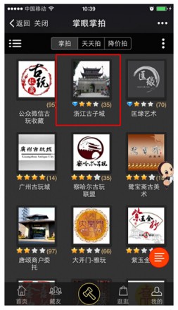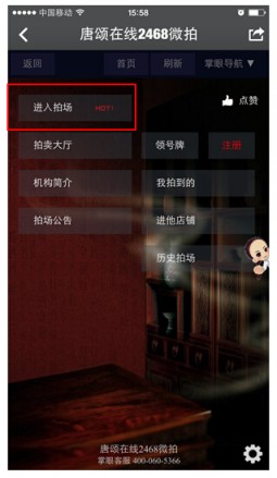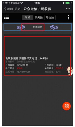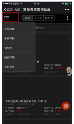(3)点[机构信息],打开拍卖机构主页,点拍场进入开拍开拍;点[历史拍场]查询该机构历史拍场。