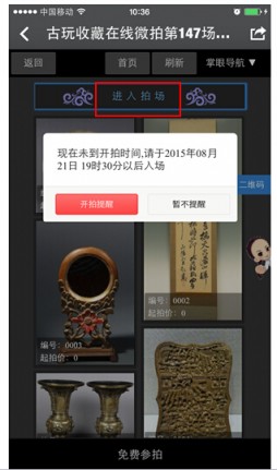 (2)拍场未开拍:点[进入拍场]后,提示可进场时间;根据需要设置开拍提醒