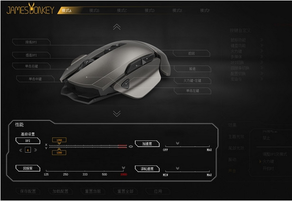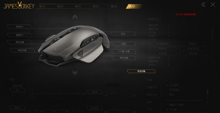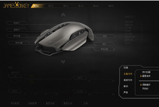 贱驴007模块化鼠标所对应的驱动将所有设置选项集中在了同一面板当中,因此显得非常直观,很容易就能找到其中的某一选项,除了鼠标按键、宏、性能等的一些选项,驱动还提供了对应的效果设置,比如光效、音效乃至震动效果。