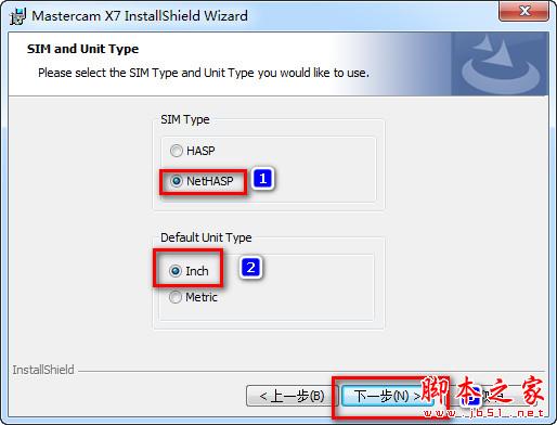 7、安装类型选择“NetHASP”和“Inch”。然后点击“下一步”继续.