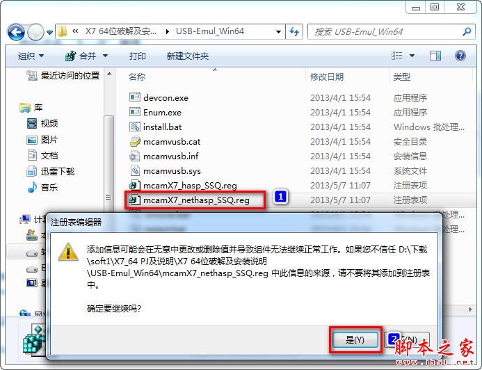 13、禁用完成后,打开破解文件夹夹 “USB-Emul_Win64”文件夹.双击“mcamX7_nethasp_SSQ.reg”加载注册表(根据安装时候选择是hasp好是nethasp)。