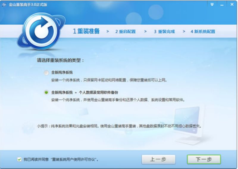 2、选择重装系统的类型,第一种是直接安装全纯净系统,该系统只保留驱动和保证重装后能上网,而第二种在第一种全纯净系统外添加个人数据及常用软件备份,让系统重装完成后,可以恢复个人数据和常用软件。选择“下一步”;(小编演示的是第二种,全新纯净系统+个人数据及常用软件备份)