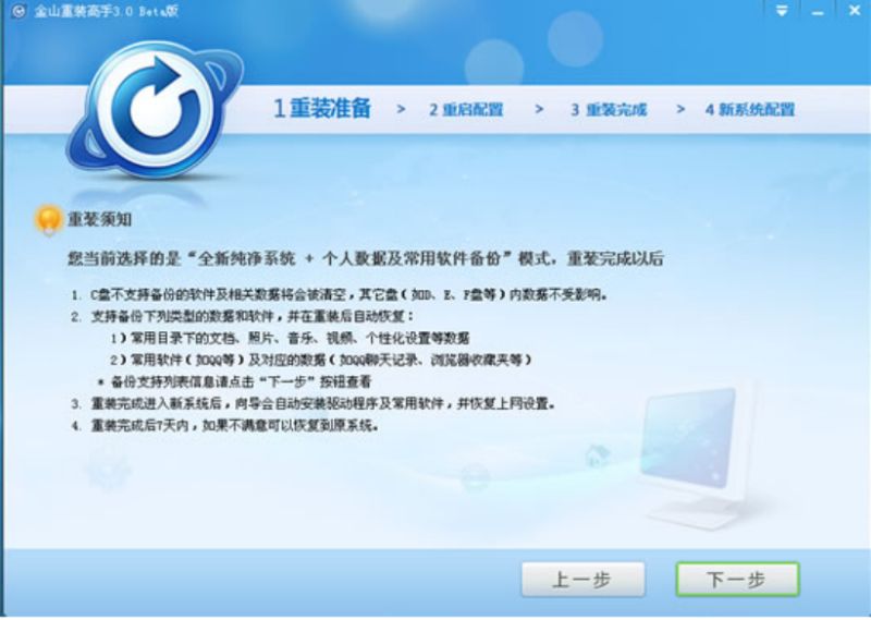 1、重装高手目前支持保留系统盘上的个人数据及大部分的主流软件、系统设置保留,详细的可以在环境检测过后,数据备份步骤的【详情】里可以找到,针对不支持保留的软件重装系统后需要您手动安装。