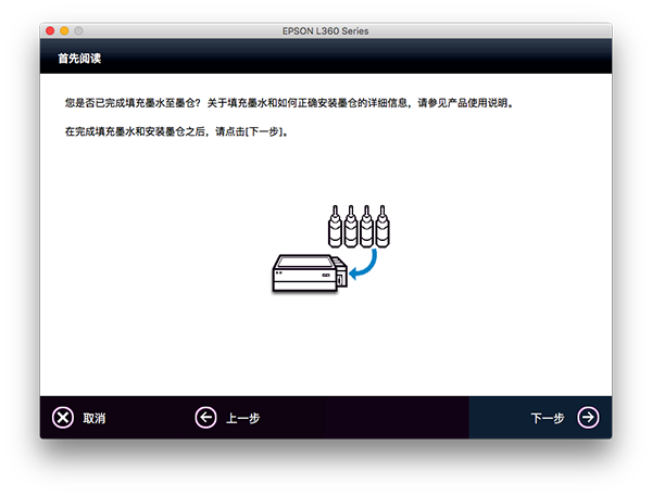 3、完成打印机填充墨水和安装墨仓之后,点击下一步继续。