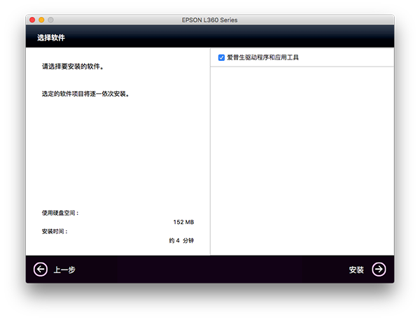 4、点击安装,等待爱普生L360驱动Mac版驱动安装完成重启Mac电脑即可。