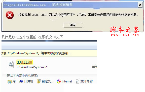 最近玩游戏的都知道,尤其是狙击精英v2,弹出少d3d11.dll这个的对话框,很纠结,其实d3d11.dll是存放在Windows(尤其是win7)系统文件夹中的重要文件,通常情况下是在安装操作系统过程中自动创建的,对于系统正常运行来说至关重要。在正常情况下不建议用户对该类文件(d3d11.dll)进行随意的修改。它的存在对维护计算机系统的稳定具有重要作用。
