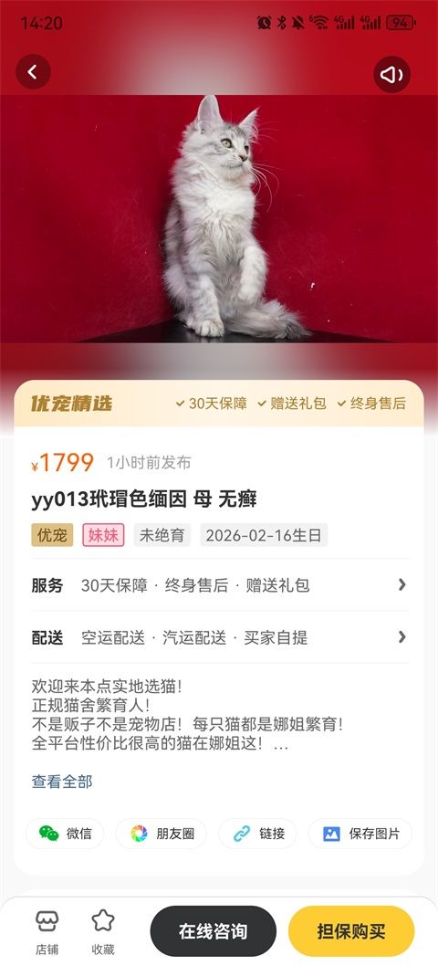 1、买家挑选心仪的宠物,点击“在线咨询”向商家了解宠物详情。