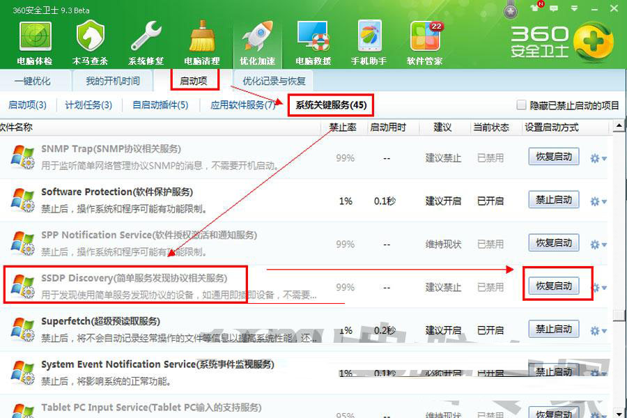 “UPNP连接失败怎样修复:”的解决方案打开安全卫士——优化加速——启动项——系统关键服务,找到SSDP服务(用于寻找upnp设备),点击“恢复启动”按钮。