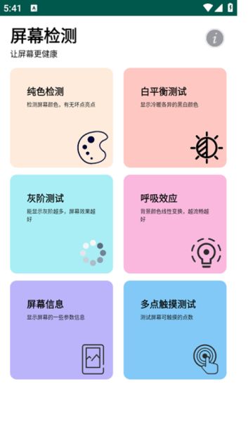 屏幕检测app是一款手机屏幕检测工具,致力于帮助用户全面了解手机设备的屏幕状况,能支持多种类型的屏幕,包括LCD和OLED,能快速识别亮点、坏点以及图像残留等问题,用户可以利用多种色彩模式进行测试,包括红、绿、蓝、黄、洋红、青、白和黑,保障全面覆盖各种显示效果。并且屏幕检测app不需要流量,操作简单,非常适合任何对手机屏幕健康感到担忧的用户,保障你的手机体验。不仅如此,屏幕检测工具手机版可以无后台启动,保护隐私,还提供纯色、白平衡、灰阶等多模式检测,能全面评估屏幕健康,动态刷新检测、坏点检测一目了然,多点触摸测试保障触控正常,全方位守护您的屏幕健康。