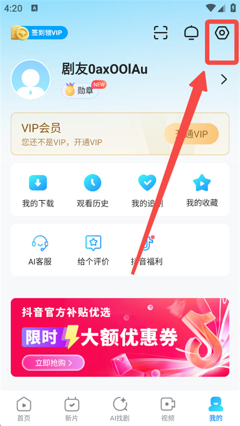 1、打开人人视频官方版App,进入【我的】页面,点击上方设置图标。