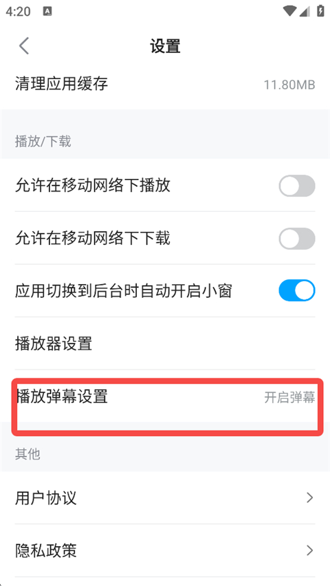2、下滑找到【弹幕播放设置】,将它给关闭即可。
