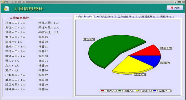 1、人口管理:实现了对辖区暂住人口、常住人口、寄住人口、空挂户以及境外人口等的基本信息、居住情况、工作情况以及人员的相关信息(包括人员关系、联系方式、特殊特征等)的信息管理,对辖区工作对象的重点人口、涉稳人员、关注对象、矫正对象、精神病人进行了全方位的信息管理。系统查询功能强大,可以模糊查询、级联查询、自定义任意条件的组合查询。