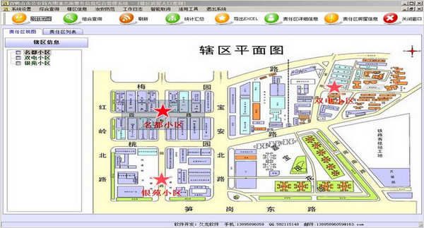 6、责任区管理:对责任区的综合信息、责任区民警信息进行了管理。其中,辖区地图功能实现了对辖区内的房屋、单位、营业场所的直观标注及定位。
