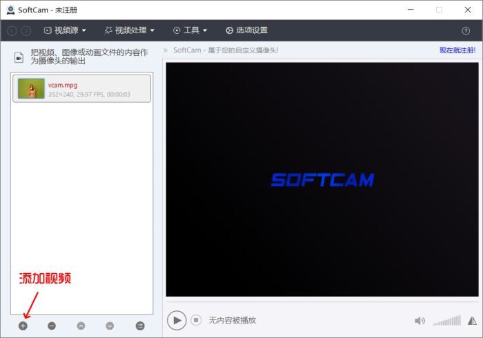 打开 SoftCam 软件,点击“添加”按钮便可添加视频文件(你也可以向播放列表中拖入视频文件来添加视频):