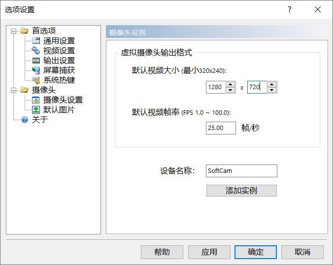 SoftCam 的默认尺寸是 640 x 480,想改成 720p 的?在 选项设置 > 摄像头设置 处设置 1280 x 720 然后 应用 或 确定 即可:
