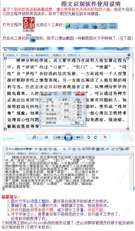 文通慧视软件的独特之处除了具有一般同款软件的图片识别功能外,最独特的是它可以像QQ截图一样,直接在电脑屏幕截取图像,对图像里的文字进行识别、转换成文本!汉王、Readiris Pro 12、尚书、清华紫光、cajviewer等都不具备这个功能,它们都是需要将特定格式的文件导入软件界面、然后进行各种图像调整后才能进行识别,尽管每一款都号称是最强的,实际上功能差别不大。文通慧视文字识别软件不敢说最强最大之类的话,只能说在识别准确率上肯定优于上面提到的几款,因为它能对变形、光线不均、字迹模糊、带有背景图案的照片进行识别,且对要进行识别的文件格式没有任何限制,只要是能在电脑屏幕显示的图片,都可以直接截图识别。