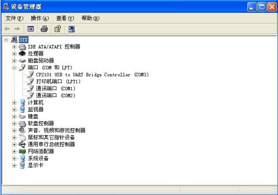 安装完USB驱动后,您可以在设备管理器中查看所用的串口号,选择我的电脑按右键选择属性,在属性中选择硬件,点击设备管理器,在管理器中选择端口(COM和LPT),出现CP2101 USB to UART Bridge Controller (COM3),则您在软件中应用的串口号则为COM3。