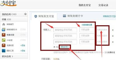 4、进入页面可以看到3个收款人的输入框和转账金额框,这时候可以就可以实现多人转账,如果转账人数超出3人的,可以点击蓝色字体+添加收款人添加,另外,可以通过平台中自带的免费短信通知服务,通知收款人已经收款成功以及收到的金额!