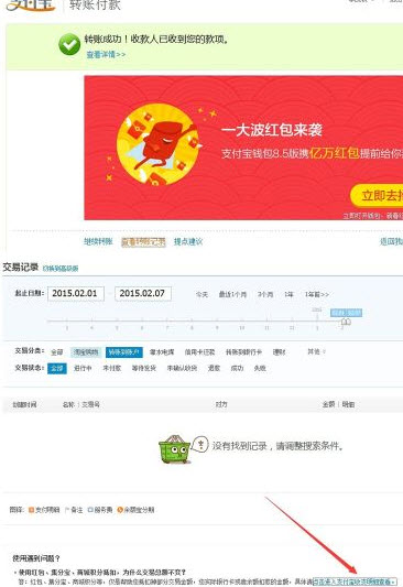 7、成功支付之后页面自动跳转,会显示转账成功!需要提醒一下的是,这时候需要查询转账记录的话,需要点击查看转账结果,但是点击进去页面后发现并没有显示结果,需要再点击该页面中的蓝色字体——点击进入支付宝收支明细查看 。就可以查看到转账结果