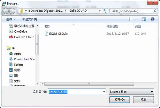 5、选择安装包“_SolidSQUAD_”目录下的许可文件“EXLM_SSQ.lic”载入