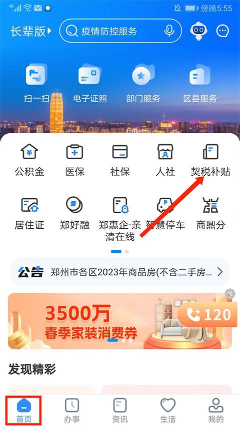 1、打开郑好办app,在【首页】界面,选择右上方【契税补贴】选项。