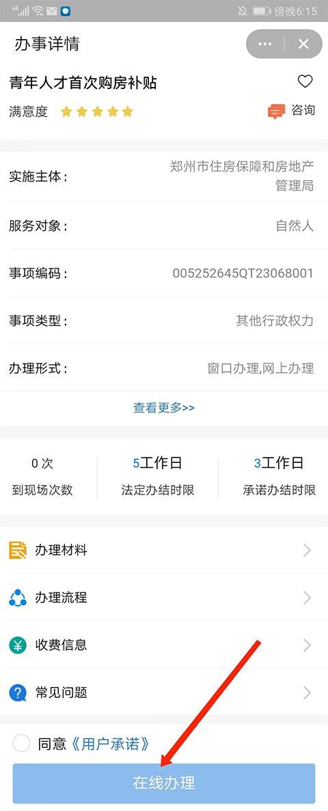 3、进入【办事详情】界面,了解完青年人才首次购房补贴相关信息后选择下方【在线办理】即可申请购房补贴了。