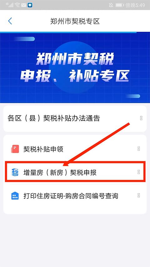 2、进入【郑州市契税专区】界面,选择【新房契税申报】选项。