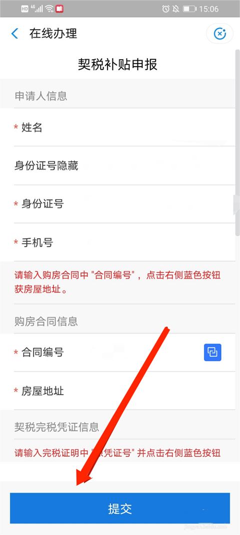 4、进入【在线办理】界面,依次填写【姓名】、【身份证号】、【手机号】、【合同编号】和【房屋地址】等信息后,选择【提交】选项,即可领契税补贴了,以上就是郑好办契税补贴流程。