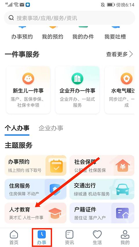 1、打开郑好办app,在【办事】界面,选择左下方【人才教育】选项。