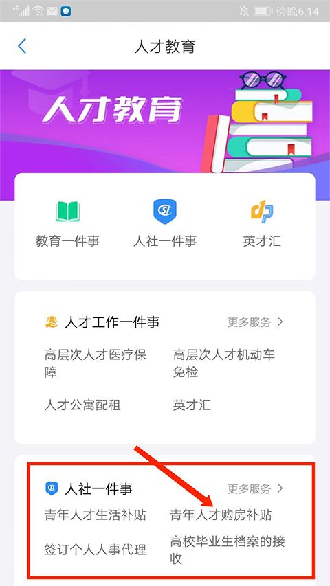 2、进入【人才教育】界面,在人社一件事栏目选择【青年人才购房补贴】选项。