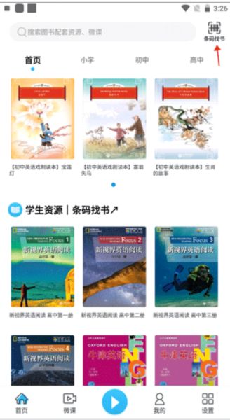 1、选择软件的“首页”这个功能界面,点击右上角的“条码找书”。