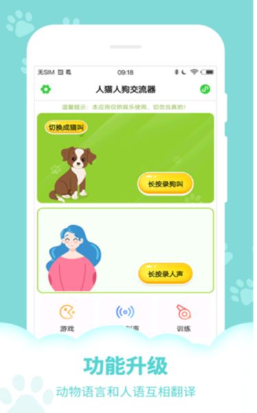 内置了许多模拟喵星人跟汪星人不同情景下发出的声音,用户可以点击播放各种不同的猫叫声和狗叫声。