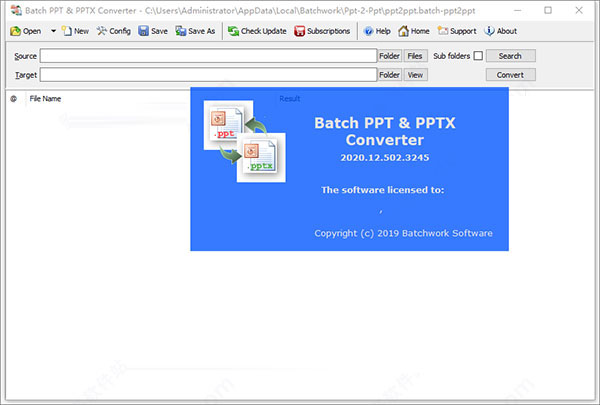 Batch PPT and PPTX Converter2020是一款可以实现ppt和pptx文件相互转换的工具,它提供了一种简单快速的方法来更改PowerPoint的文件类型,其软件界面简洁,操作简单明了,仅需几个命令按钮,甚至那些从未转换过文件的人也可以掌握,可以轻松的将ppt文件转换为pptx文件。同时软件支持多个文件或整个文件夹进行转换,转换完成后,文件会在大屏幕上列出,该屏幕上会显示新的文件类型和位置,另外软件还支持使用命令行进行转换和功能强大的搜索批处理文件功能,兼容ppt2003、ppt2007等版本,转换速度快,是你最好的ppt转pptx工具。ps:小编本次带来的是Batch PPT and PPTX Converter破解版,内附破解文件可以完美激活软件,让用户可以使用全部功能,其详细的安装教程可参考下文操作,亲测有效,有需要的朋友可放心下载。