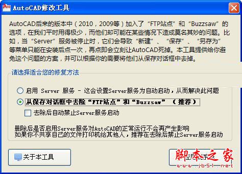 AutoCAD修改工具是一款可以帮助你解决AutoCAD出现的问题。AutoCAD后来的版本中加入了“FTP站点”和“Buzzsaw”的选项,在我们平时用得极少,而他们却可能在某些情况下造成莫名其妙的问题。比如,当“Server”服务被停止时,它们会导致“新建”、“保存”、“另存为”等菜单只能在安装后点一次,再点即会立刻让AutoCAD死掉,需要的朋友快来下载使用吧。