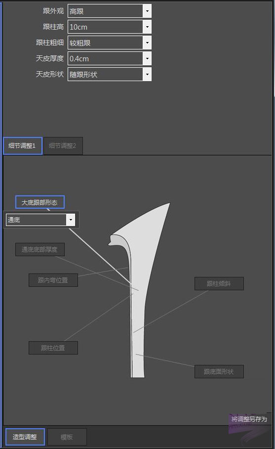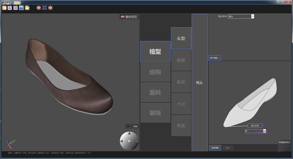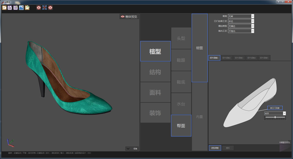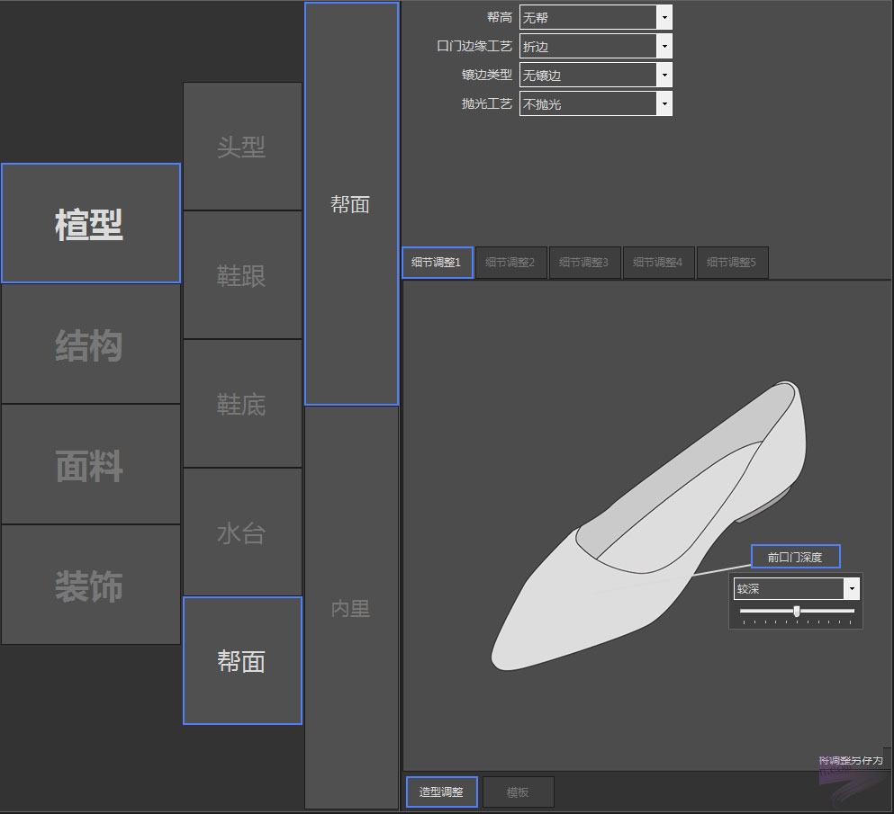 4.1.11.3 详细调整区,可以调整鞋子每一处细节的造型、面料、使用的材料和工艺,调整的过程中模型会跟随调整的变化而进行相应的变化,如下图: