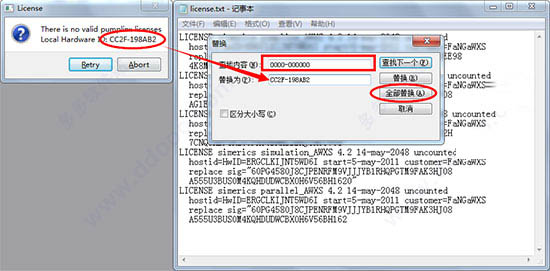 5、安装完成后,运行PumpLinx4桌面快捷方式,弹出许可窗口不要关闭,打开安装包“Crack”目录,运行“license.txt”,点击编辑》替换(快捷方式Ctrl+H),在查找内容中输入“0000-000000”替换为许可错误中的机器码,然后记得保存退出