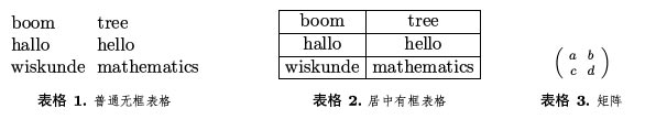 下面演示的是普通表格,居中有框表格和矩阵。下面的带标题的小表格是通过插入→表格→小表格标题得到的。小表格允许你将多个表格并列排在一行上,而大表格一行只能有一个。通过插入→表格→大表格标题可插入大表格。
