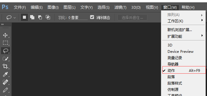 2、点击动作,出现一个动作窗口,并点击右上角的按钮