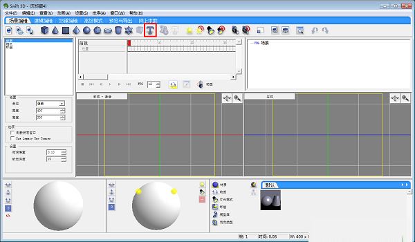 3、Swift 3D简单易用,熟悉Flash和3D MAX的朋友能够很快上手。Swift 3D的大小为7.14MB,你可以从erain官网下载它的最新版本。下载安装完毕后,我们可以先看看Swift 3D的操作界面,将界面分为6个功能区,动画制作的所有流程都在这些功能区内完成。其中,属性面板显示内容将随你当前所编辑对象的不同而变化;时间轴控制动画的流程;预览区可以在动画制作过程中随时观看制作效果;每个对象在场景中的位置和表面光照效果将在对象控制区和光照控制区内完成。熟悉了Swift 3D的工作界面之后,基本成竹在胸了。