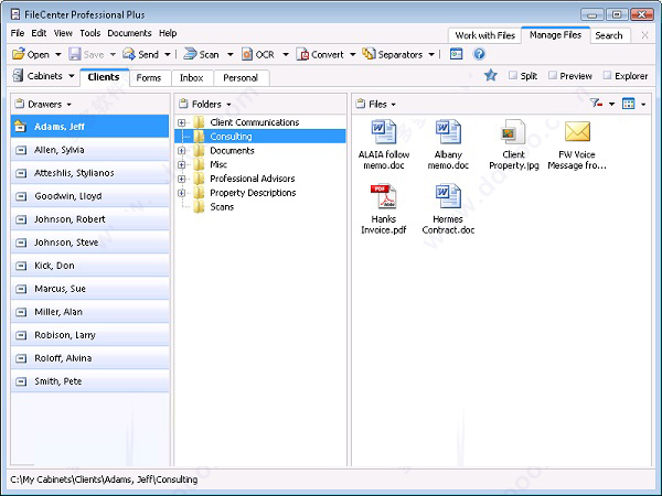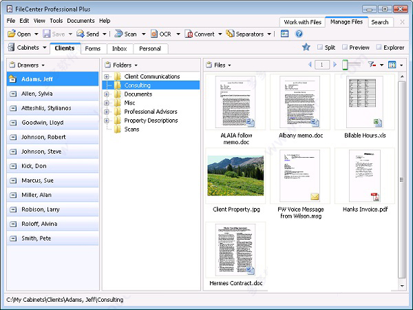 FileCenter文件管理软件具有电子控制台界面,将您的数据组织成抽屉、文件夹和文件,并分为三个视图,便于左右导航。文件可以显示为大图标、小图标、缩略图或细节视图。将FileCenter分开的一个功能是与其他Windows程序的兼容性。我们的文件管理软件将您的文件存储在本机Windows文件夹中,而不是将其锁定在专有数据库中,所以即使您停止使用FileCenter,它们也始终可用于其他程序。