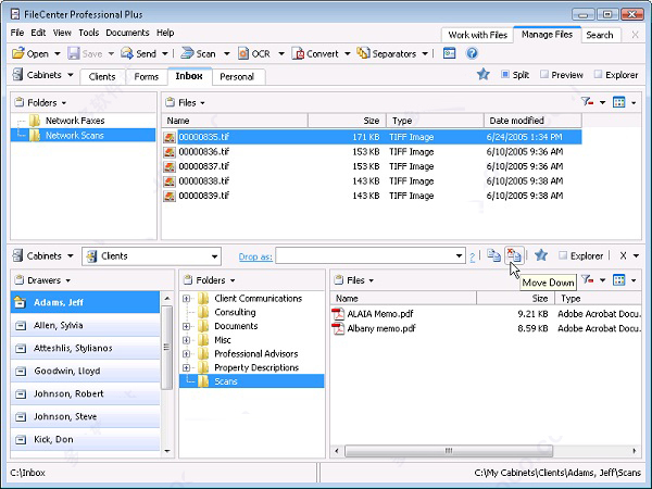 维护一个干净,有组织的文件系统的一个重要部分是移动和重新提交文件。通过FileCenter,您可以为传入文件(如网络扫描或传真)定义收件箱位置。还有一个拆分视图。两者都可帮助您轻松地重新组织机柜或从外部将文件带入机柜。您甚至可以在移动时即时重命名文件和文件夹。