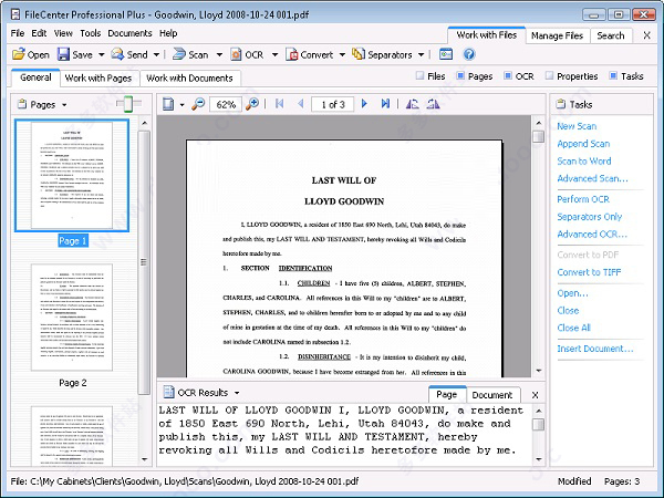 扫描到的文件只是一张图片。要从扫描中获取实际文本,您需要OCR光学字符识别。OCR通过其形状识别扫描中的字母和字符,为您提供实际的文本来搜索,索引或拉入文字处理器。FileCenter包含内置的OCR。标准版具有基本的OCR引擎,而高级版具有更高精度的OCR引擎,并支持非英文字符。
