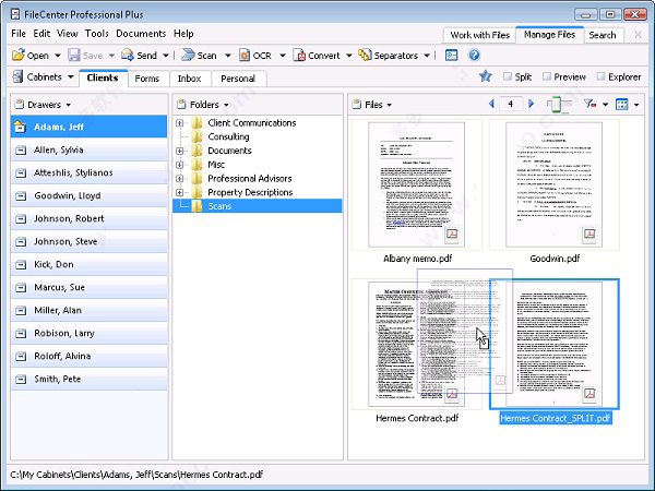 在FileCenter Professional中,您可以“堆叠”或加入PDF文件,而无需打开它们。只需在“ 管理文件”视图中将一个PDF拖放到另一个PDF上即可。FileCenter Professional还提供增强型缩略图视图,您可以在其中翻阅PDF缩略图中的页面,甚至在不打开文件的情况下分割PDF文件或提取页面。