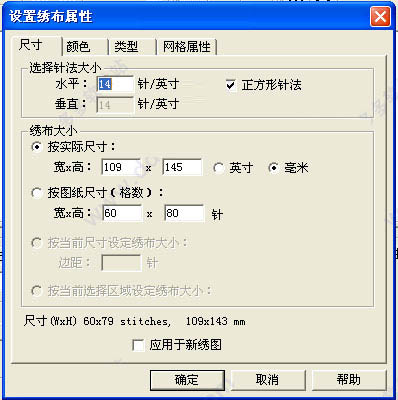 2、点击“菜单”—“新建”按钮创建一个新的绣布,我们可以对其进行基本的设置,如下图所示: