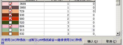 6、勾选需要减省的绣线,确认后软件系统会自动根据绣线颜色,在已使用的绣线范围内查找最佳的绣线代替
