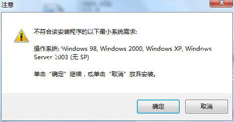 2、由于目前普遍的用户电脑都是Win7以上操作系统,所以此时可能会弹出提示框“不符合该安装程序的以下最小系统要求......”,这时用户无需多管直接点击“确定”继续接下来的安装