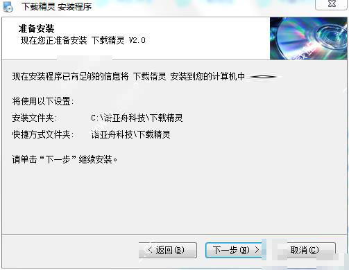 6、自定义或默认诺亚舟下载精灵的安装路径,默认路径为C:\诺亚舟科技\下载精灵,可点击“更改”更换安装路径,或直接默认点击下一步