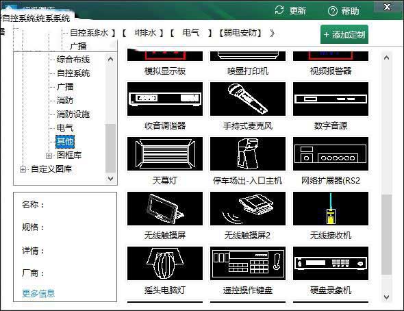 10、在CAD智能弱电软件的图库里面,已经收集到了多种设计的图纸,可以选择一个类型的使用,例如点击弱点安防的功能,就可以选择电气报警、收音调节器等