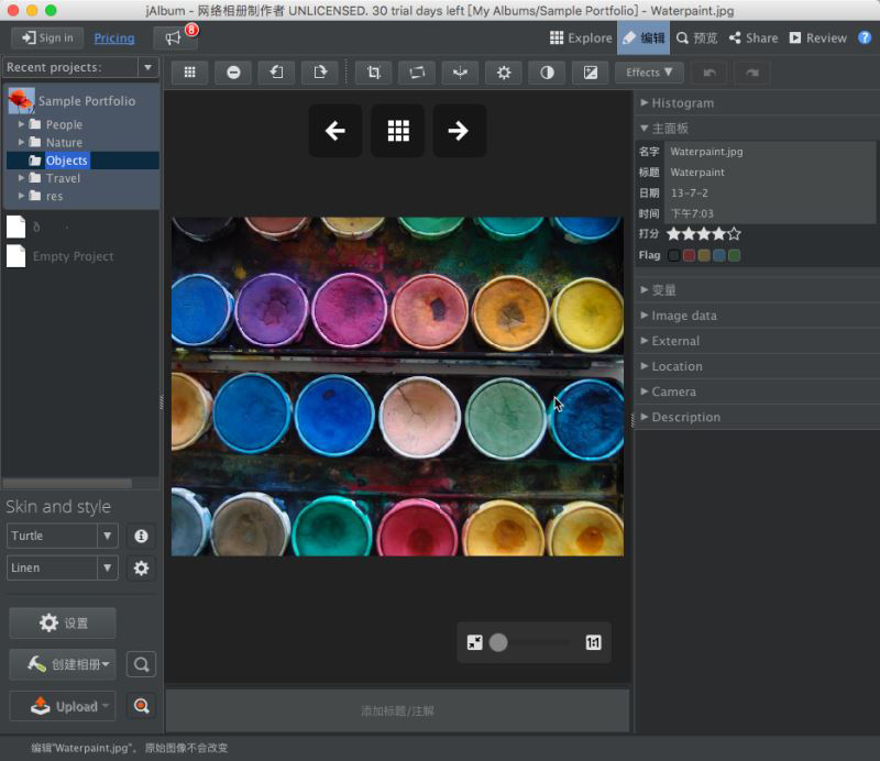 jAlbum for Mac相册制作软件可以帮您对照片进行简单的处理后可以制作成相册。jAlbum mac破解版的功能强大,使用简单,软件中还有很多好看的模板可以选择使用,让您的照片变得更加生动,把回忆留在相册中。JAlbum向用户提供了一种最简单、最便捷的网络相册创建方式。唯一需要你操心,是照片的选择与相册的风格。